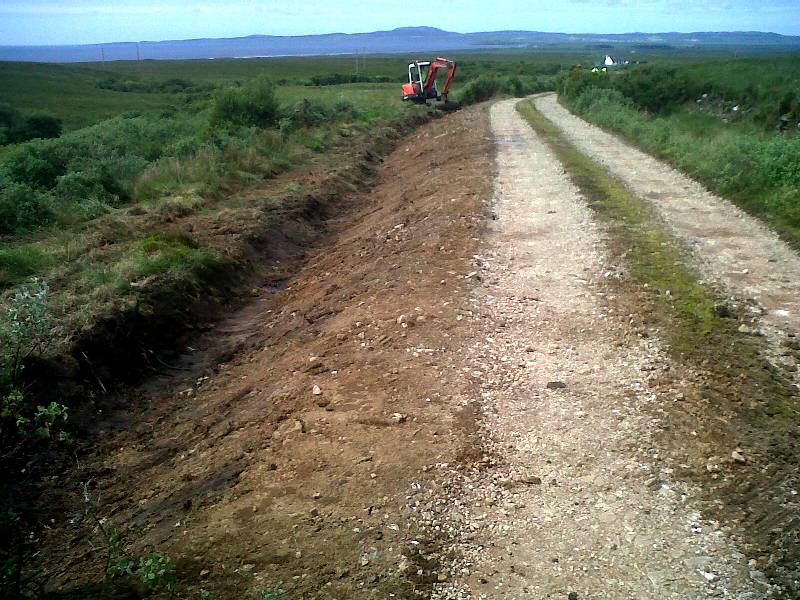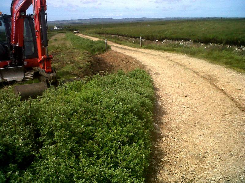 As of mid June, the contractors, W&M Currie, are making good progress upgrading the track from the High Road to the turbine site. The track is being widened in some places to accommodate the very long (21 m) delivery vehicles, and the track-side drainage is also being improved.