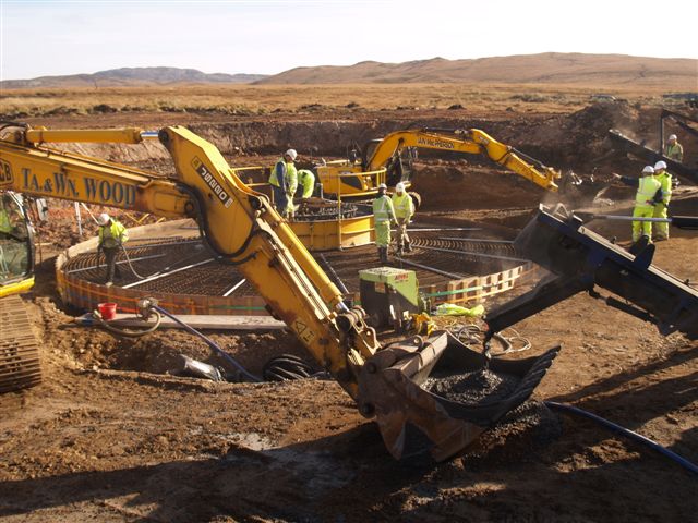 A wind turbine needs to stand on robust foundations and this has entailed the excavation of a hole 15 metres across and 3.7 metres deep. The hole has now been filled in with compressed layers of a sand and gravel mixture, followed by a massive concrete plinth into which the foundation bolts and a network of thick steel rods have been set, to which the turbine will be bolted.